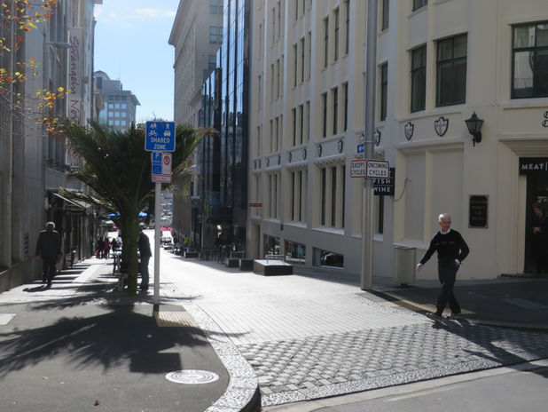 Special pavement is used to make the shared space distinct from conventional streets, delineate zones within the shared space, and create an attractive environment.